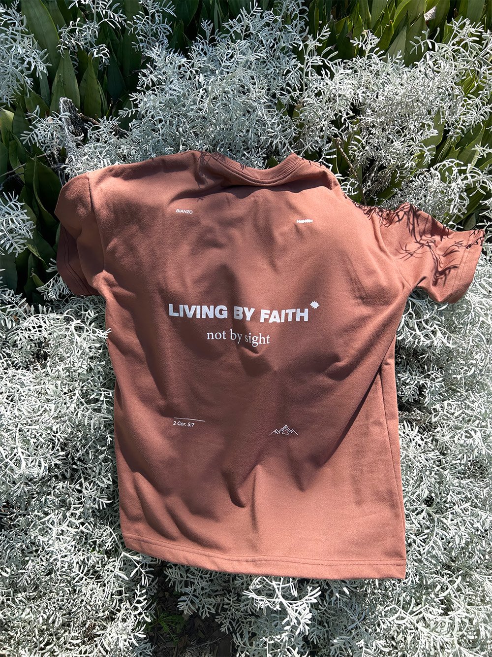 Camiseta “Living by faith” – Oversized – P, M, G, GG – Cor Marrom